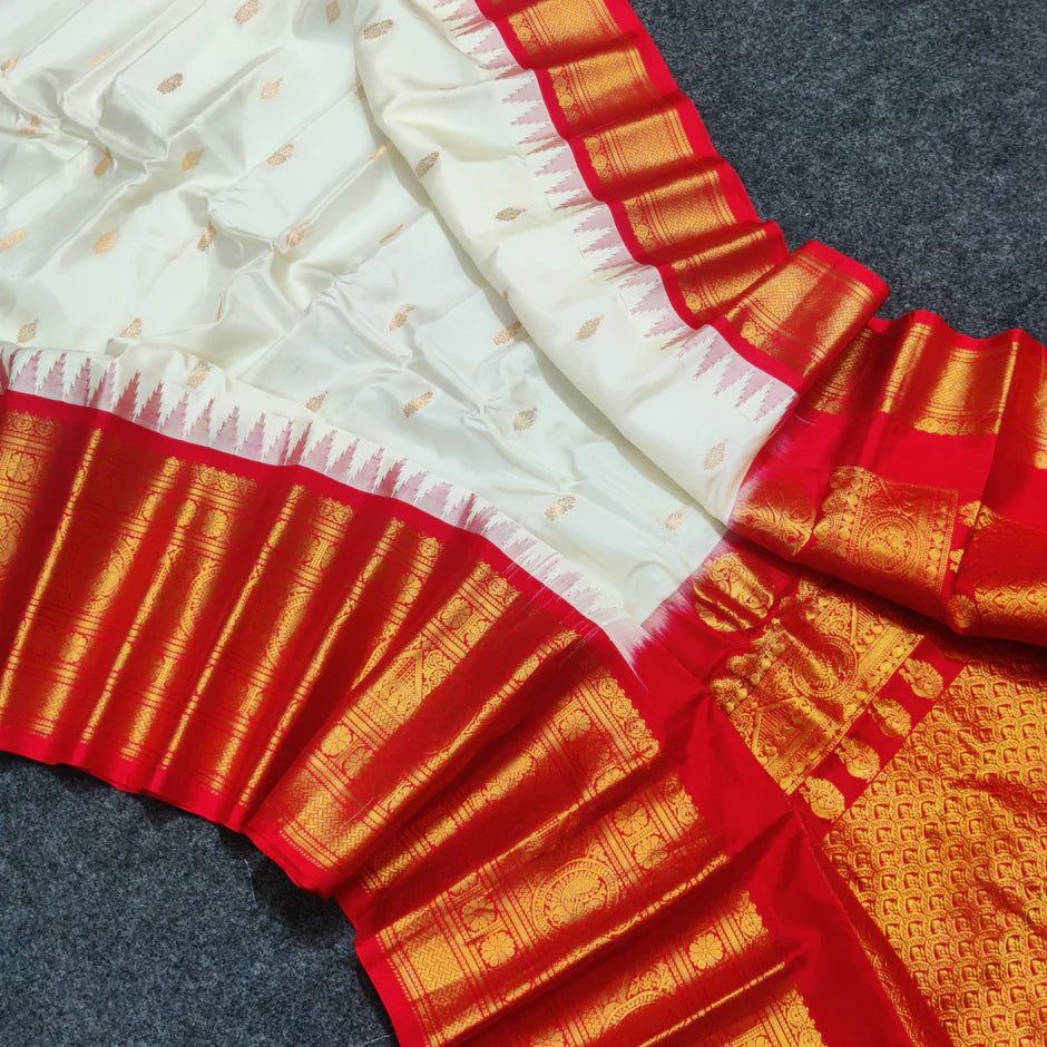 Experience the timeless elegance of authentic Gadwal weaving with this exquisite Pure silk handloom saree. The Half white body is adorned with intricate gold zari motifs that catch light beautifully, while the striking Rich Red gold zari border frames the drape with sophisticated contrast. Handcrafted using traditional techniques passed down through generations, each saree showcases the meticulous artistry Gadwal is renowned for. The accompanying pink blouse complements the ensemble perfectly, creating a cohesive, refined look suitable for weddings, festivals, and special occasions. Contrast Blouse and Silk Mark Certified